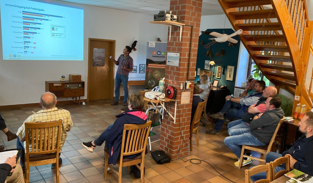 Während seines Vortrags klärte Ralf Demmerle auch über die Ursachen des Artensterbens, wie eine immer intensiver werdende Landwirtschaft, sowie die damit verbundenen Auswirkungen auf unsere Lebens- und Wirtschaftsweisen auf. In der anschließenden Diskussionsrunde wiesen einige Landwirt*innen auf die Probleme in der modernen Landwirtschaft hin, deutlich wurde aber vor allem die Dringlichkeit zu handeln in Anbetracht des schlechten Zustandes der Biodiversität auf Äckern, Weiden und Wiesen – und die besondere Rolle von Verpächter*innen, die Möglichkeit haben, diesen Entwicklungen gezielt entgegenzusteuern. Am Ende waren sich alle einig, dass nur ein gemeinsames Handeln von Naturschutz und Landwirtschaft den entscheidenden Beitrag zu mehr Artenvielfalt leisten kann – Hand in Hand für die Natur.